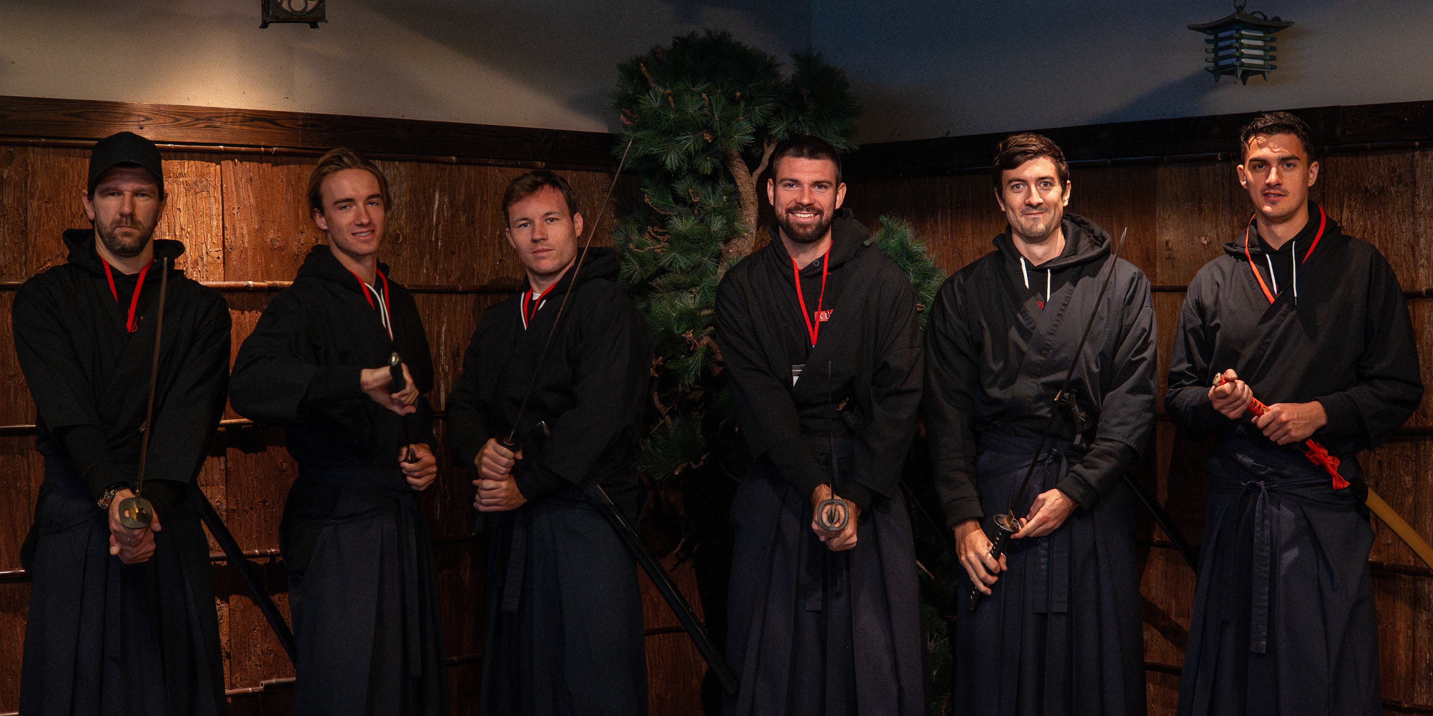 Vor den ersten Aufschlägen stand für Sebastian Ofner, Jurij Rodionov, Lukas Neumayer, Lucas Miedler und Alexander Erler am Sonntagvormittag nach einem kurzen Sightseeing noch ein Teambuilding-Event auf dem Plan, natürlich zusammen mit Kapitän Melzer; und zwar in Form eines Samurai-Kurses. Die ÖTV-Herren erlernten dabei das richtige Tragen des traditionellen Kimonos und Hakamas (Hosenrock), respektvolle Umgangsformen wie das Verbeugen und das Schwingen mit dem Katana (japanisches Langschwert), ehe es an teaminterne Kampfhandlungen ging. Alles aber kein Anlass zur Sorge: Die Sicherheit der rot-weiß-roten Tennisasse hatte hierbei selbstverständlich immer oberste Priorität. Nach einigen Übungsschwüngen mit echten, aber nicht scharfen Katanas wurden diese letztlich gegen Gummischwerter ausgetauscht, mit denen ausschließlich die Beine des jeweiligen Gegners ins Visier genommen wurden.
