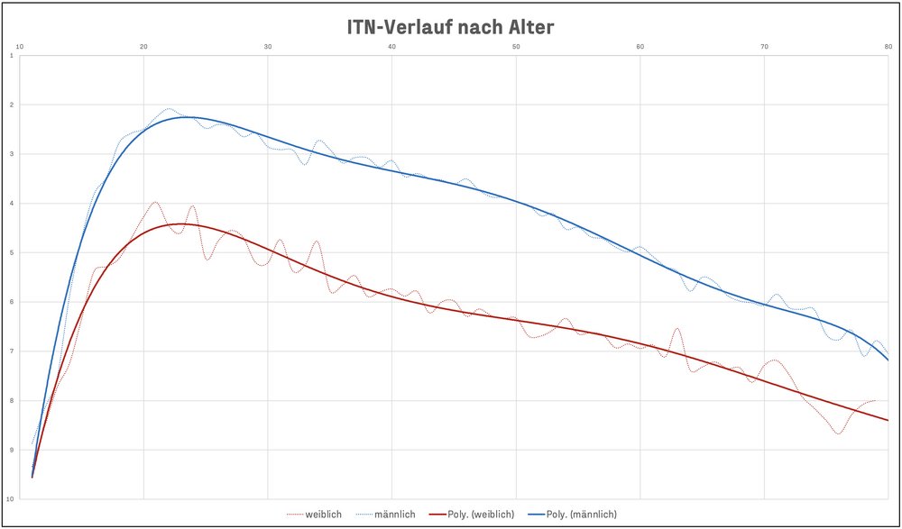 In diesem Diagramm ist zu sehen, wie sich die ITN-Spielstärke bei den besten Spieler:innen im Alter durchschnittlich verändert.